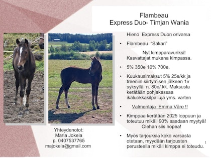 MT Hevosmarkkinat on kätevä kauppapaikka, jossa voit myydä, ostaa ja vuokrata hevosia, kuljetuskalustoa ja kilpakärryjä. Ilmoittaminen on maksutonta.Ilmoitus on voimassa 3 kuukautta.